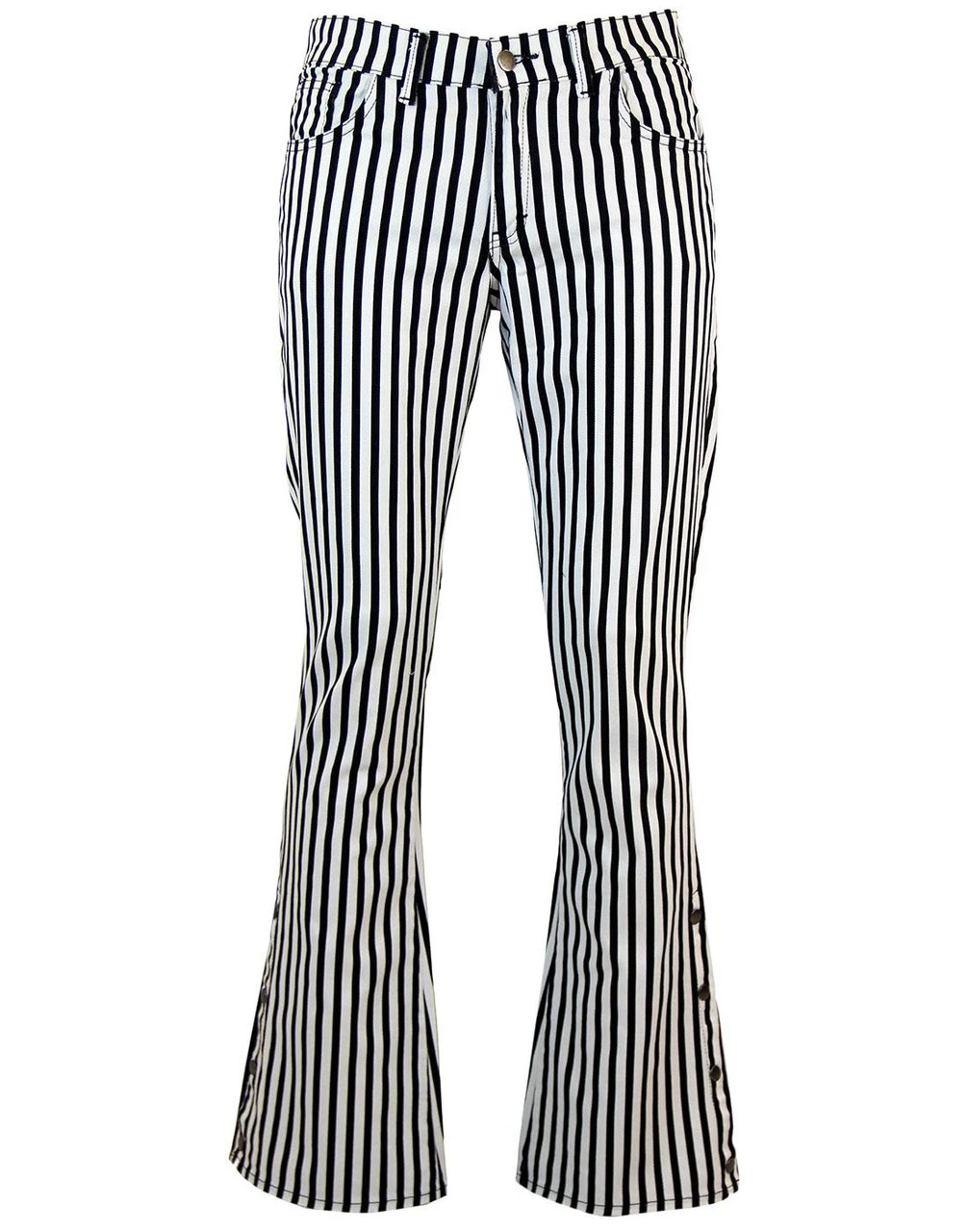 DUKE’ RETRO MENS STRIPED BOOT CUT FLARES BY MADCAP ENGLAND – Madcap England Mens Retro Sixties/Seventies style Black and White Striped Boot cut flares with press stud bottoms. Button waist. Zip fly. Low rise (hipster) waist. Pockets to front and reverse.