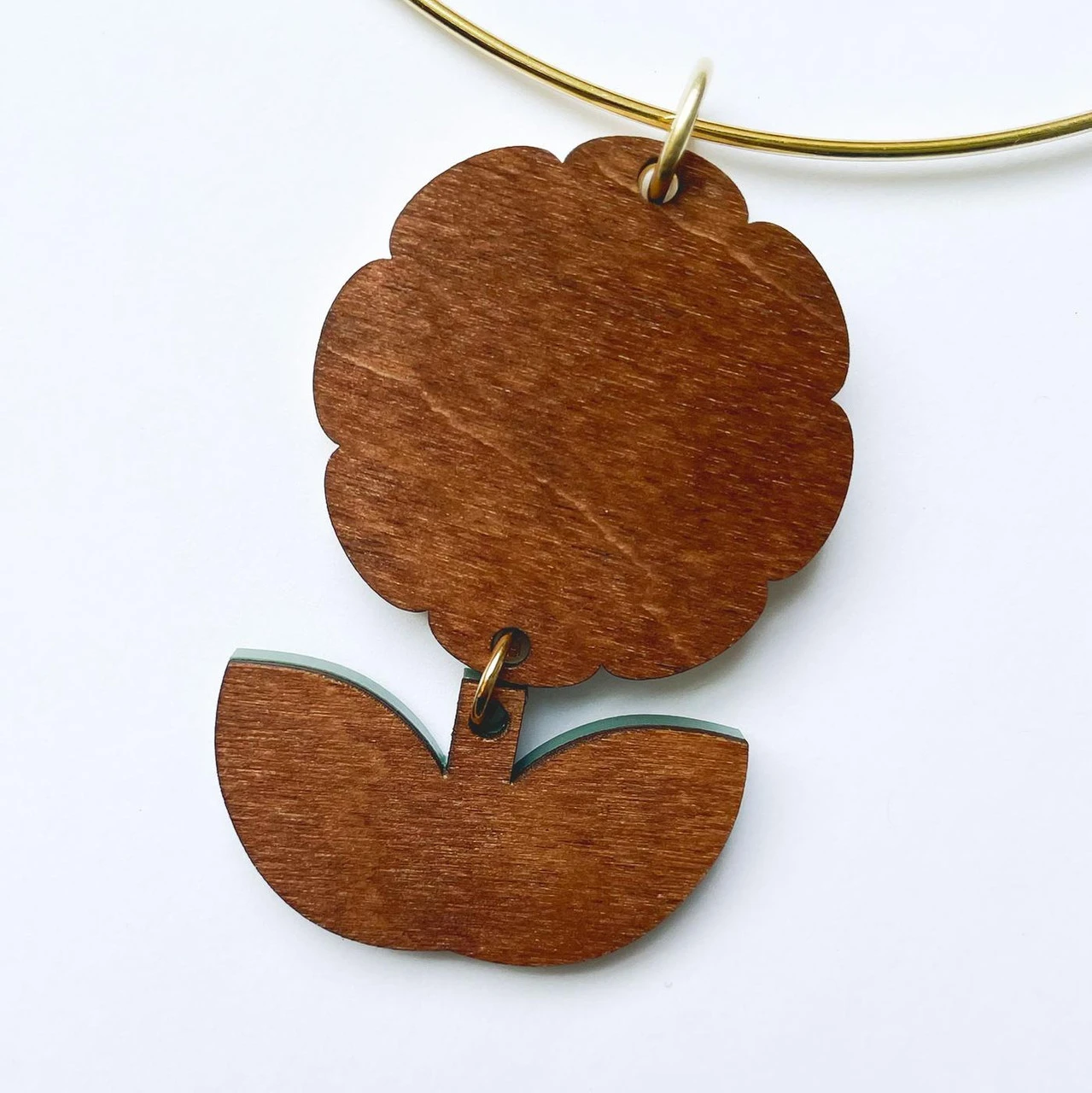 - Composition: Acrylic pendant design with wood backing and wire choker