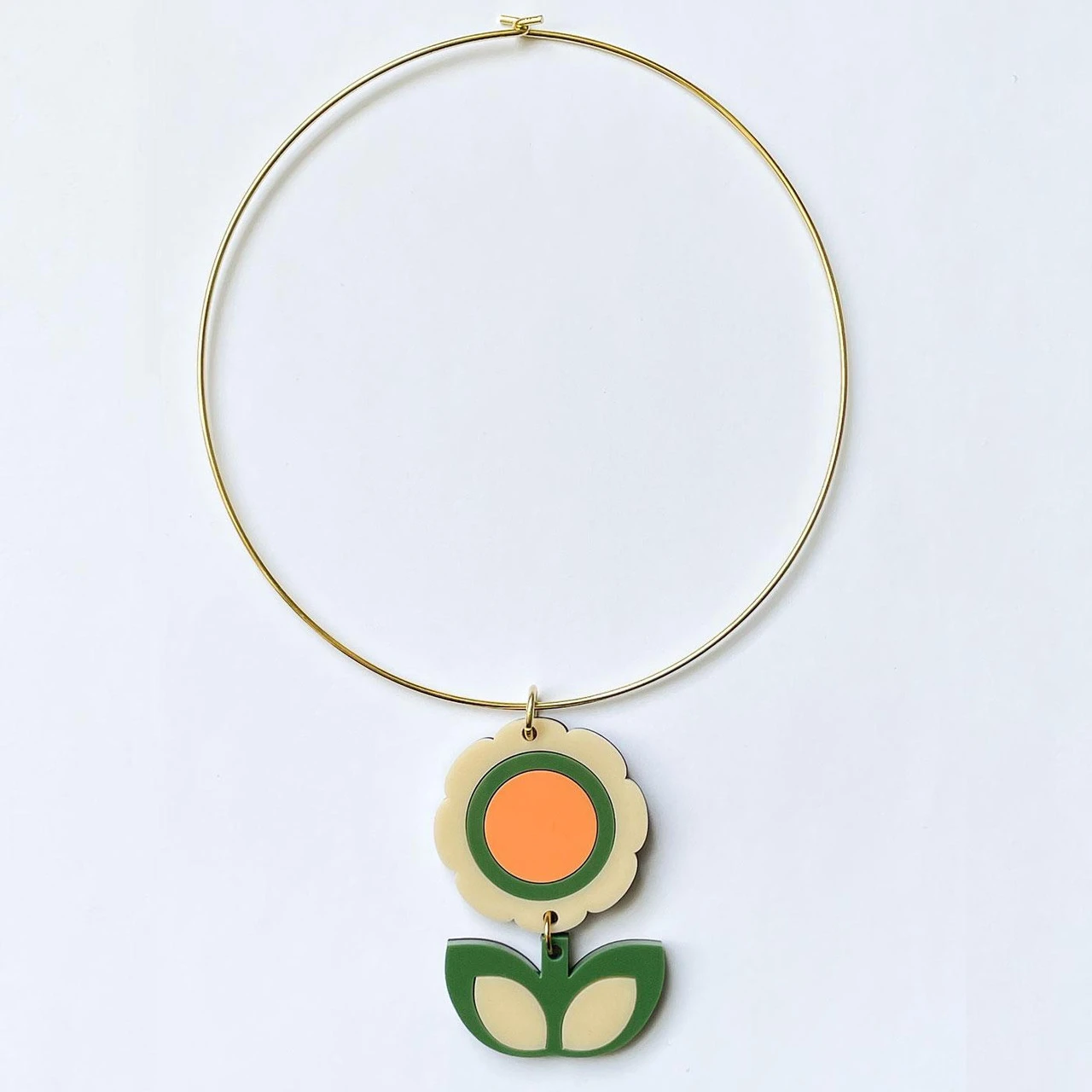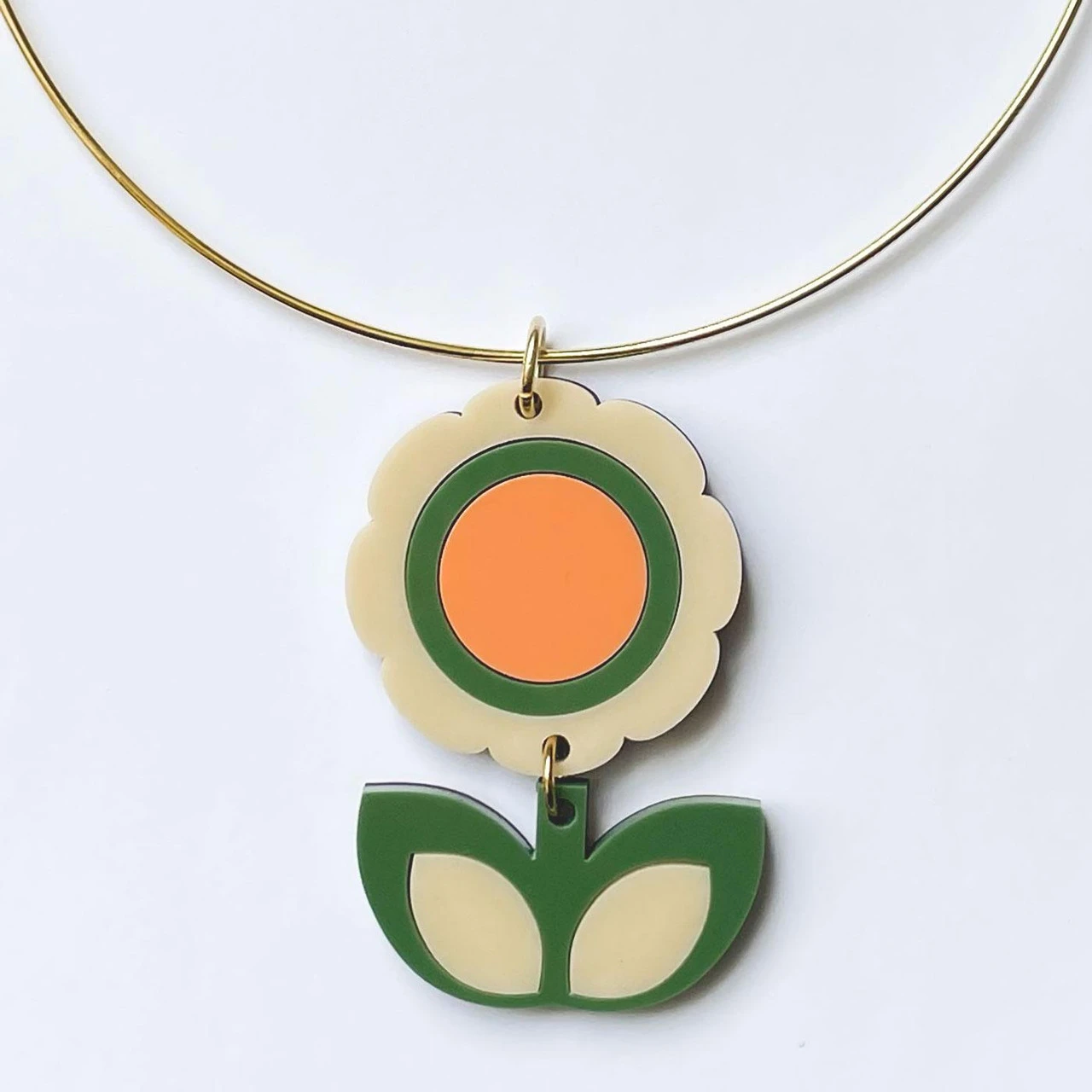 - High gloss acrylic cut out flower and leaves pendant in green, orange and Ivory