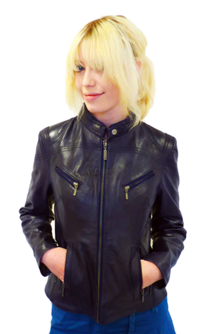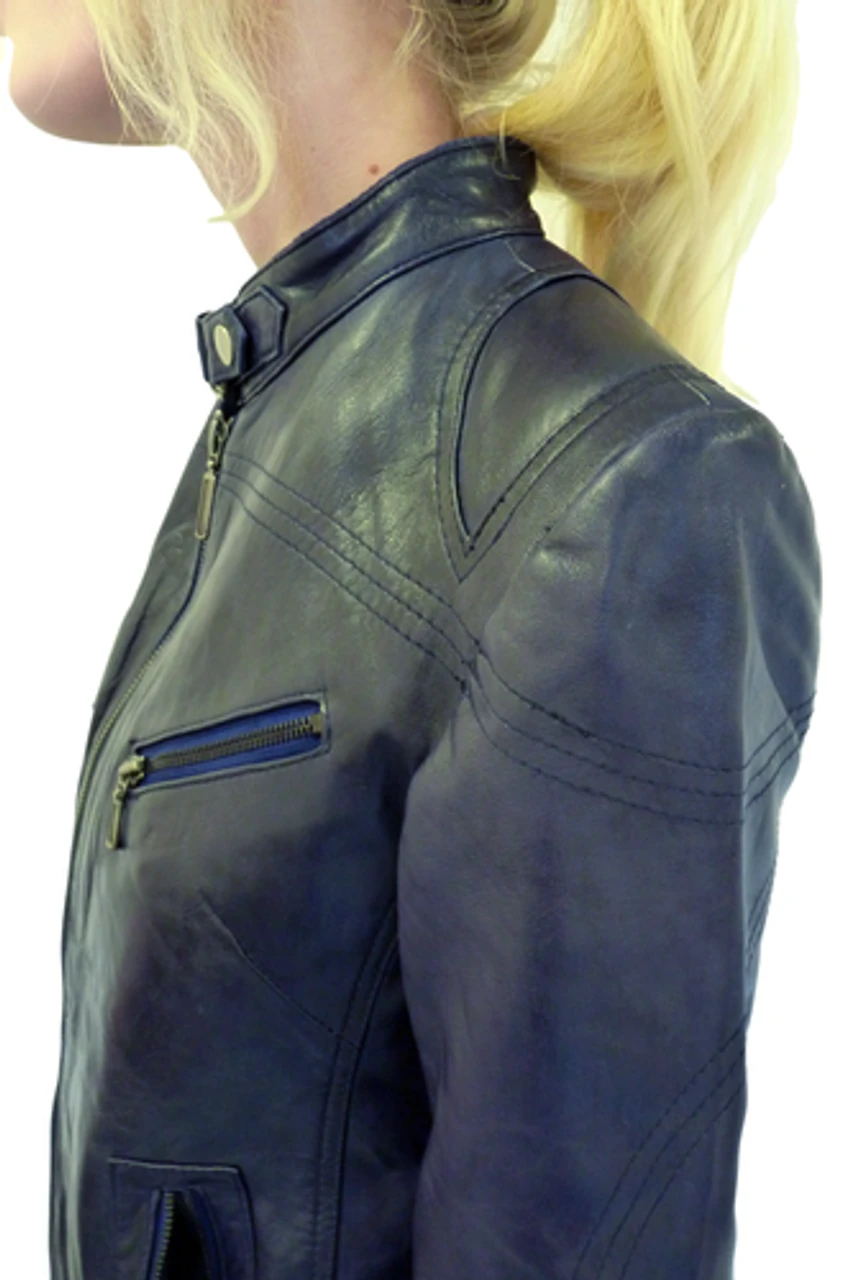 MADCAP ENGLAND ‘MARIANNE’ WOMENS RETRO INDIE LEATHER BIKER JACKET – Womens Retro navy blue leather jacket with snap fasten racing tab collar, waxed Vintage look and Indie panel finish. Multiple zip pockets, nice fit and cute and cool striped lining.