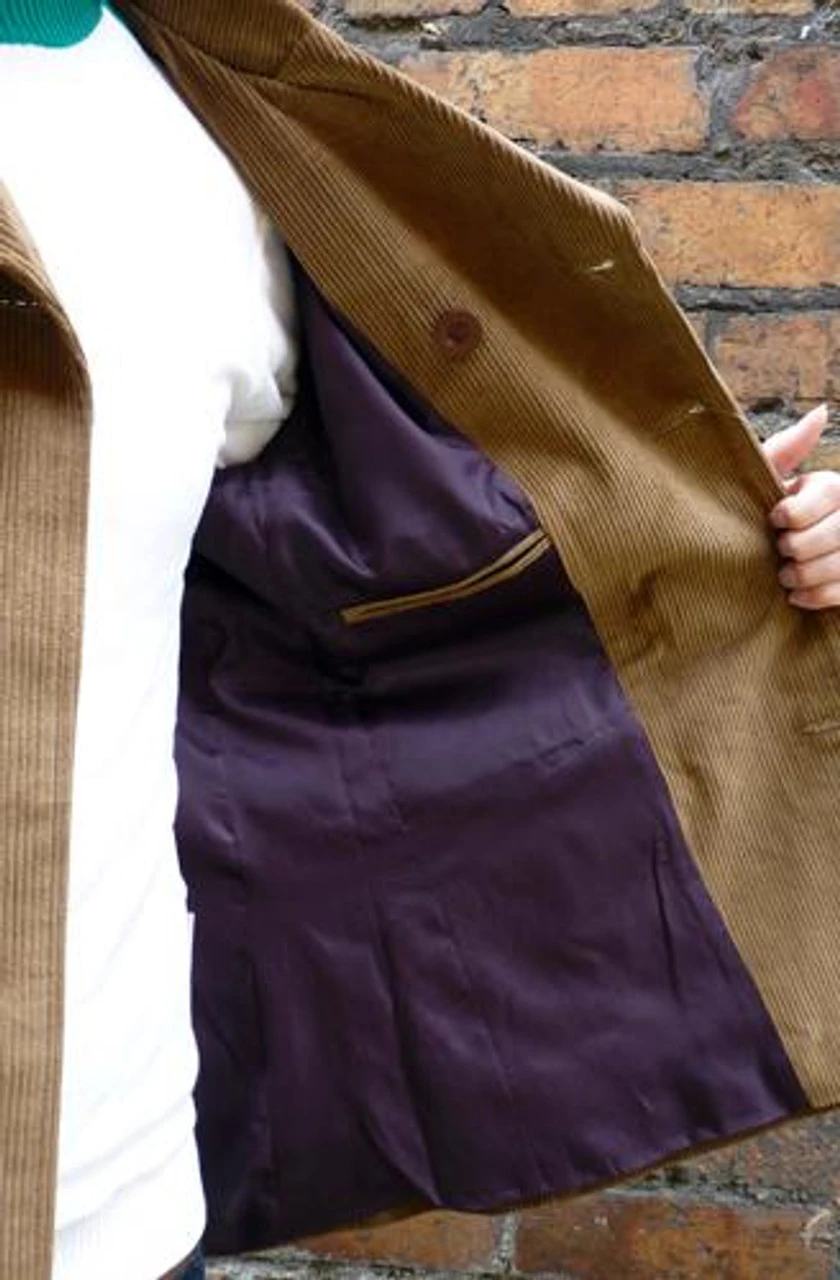 ‘THE RARE BREED’ MENS RETRO MOD SUIT JACKET by MADCAP ENGLAND – Based on the Original Design by Velvet Illusion’s Michael Wolf. Immaculate Camel corduroy, double breasted, Brian Jones style Mens tailored jacket. Contrast lined, concealed inside pocket. Two flap pockets, superb retro, Mod rounded peak lapel detail with obligatory 60s/70s inspired oversized collar.