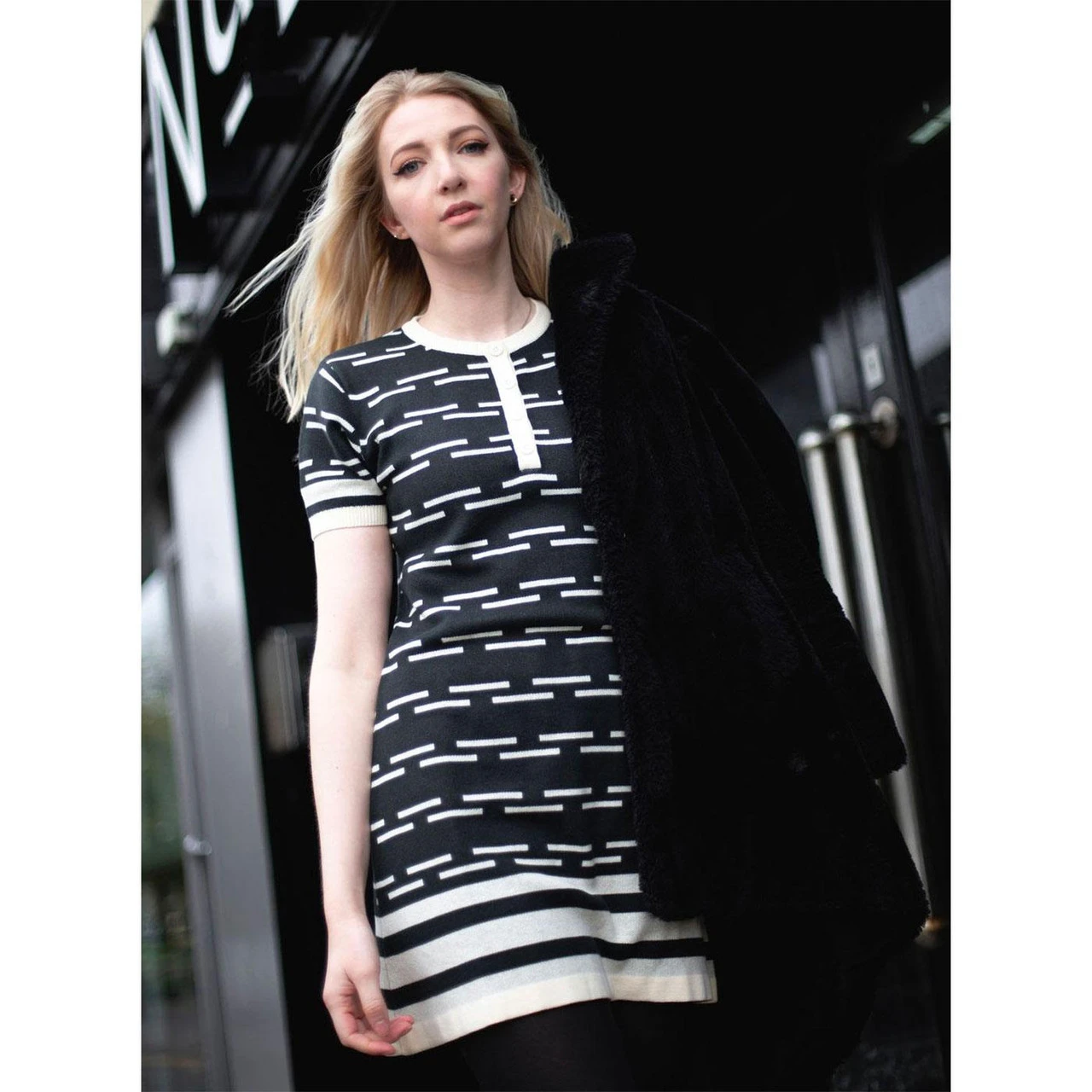 - Abstrast dash broken stripes to body with contrasting stripes in off white to skirt hem and sleeve